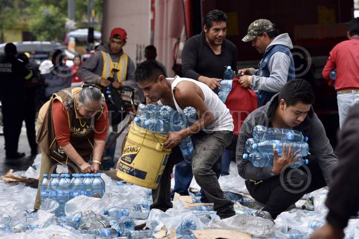 TOLUCA, ESTADO DE MÉXICO, 04JUNIO2019.- Después de registrarse el choque de un trailer con transportaba aguas y refrescos, con el tren en Paseo Tollocan y avenida Comonfort, la gente que pasaba por el lugar, trabajadores y vecinos de la zona se llevaron el producto que quedó regado en el lugar, algunos llegaron con bolsas de mandado, carretillas o cajas de plástico para poder llevarse todo lo que pudieran. FOTO: CRISANTA ESPINOSA AGUILAR /CUARTOSCURO.COM