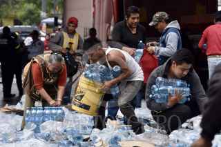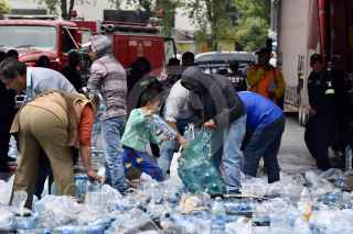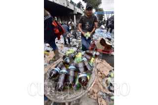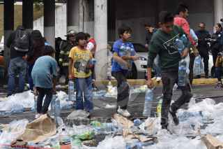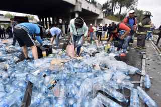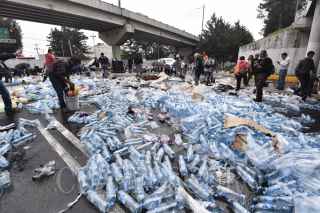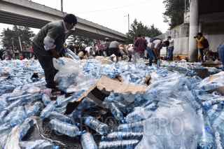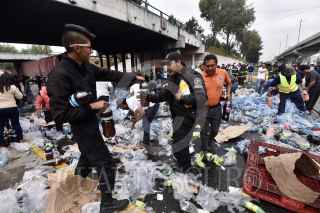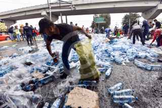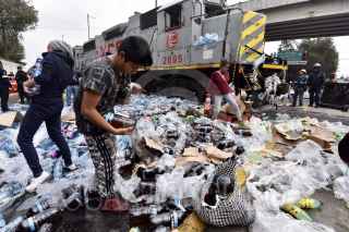 TOLUCA, ESTADO DE MÉXICO, 04JUNIO2019.- Después de registrarse el choque de un trailer con transportaba aguas y refrescos, con el tren en Paseo Tollocan y avenida Comonfort, la gente que pasaba por el lugar, trabajadores y vecinos de la zona se llevaron el producto que quedó regado en el lugar, algunos llegaron con bolsas de mandado, carretillas o cajas de plástico para poder llevarse todo lo que pudieran. FOTO: CRISANTA ESPINOSA AGUILAR /CUARTOSCURO.COM