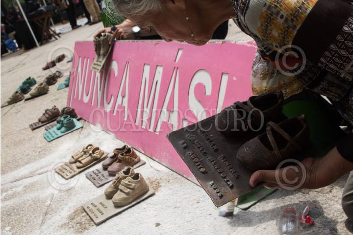 CIUDAD DE MÉXICO, 05JUNIO2019.- Padres de los 49 niños que murieron en el incendio de la guardería ABC en Hermosillo, Sonora, se manifestaron en Antimonumento colocado en su memoria frente a las oficinas del IMSS, hoy se cumplen 10 años de esta tragedia sin que hasta la fecha se haya castigado por su responsabilidad. Los padres colocaron 25 zapatitos de bronce al pie del Antimonumento con el clamor de justicia para sus hijos. FOTO: MOISÉS PABLO /CUARTOSCURO.COM
