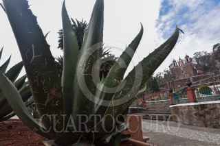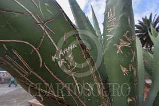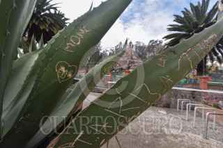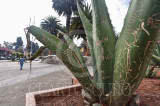 METEPEC, ESTADO DE MÉXICO, 06JUNIO2019.- Los magueyes que se encuentran en las jardineras del Calvario de Toluca son marcados por algunos visitantes, grabando en sus pencas nombres, frases, fechas, maltratando estas plantas, símbolos de este municipio. FOTO: CRISANTA ESPINOSA AGUILAR /CUARTOSCURO.COM