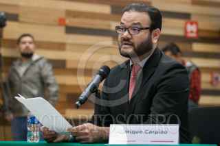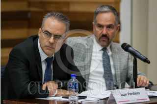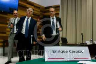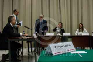 CIUDAD DE MÉXICO, 07JUNIO2019.- Enrique Carpizo expuso durante su tiempo de entrevista tras conseguir un amparo ante su expulsión del proceso para integrar el Comité de Participación Ciudadana, el abogado remarcó que no pretende formar parte de un comité que viola la constitución. Asimismo, el académico acusó a los integrantes del comité: Juan Pardinas, José Luis Caballero y Sergio López Ayllón de formar parte de una “mafia” en conjunto con el actual ombudsman Luis Raúl González Pérez y el ex rector José Narro. En la imagen, Juan Pardinas y José Luis Caballero escuchan al jurista. En la imagen los tres acusados por el jurista escuchan al ponente. FOTO: GALO CAÑAS /CUARTOSCURO.COM