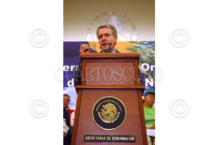 MEXICO, D.F. 17MAYO2005.- Lázaro Cárdenas Batel, gobernador de Michoacán, Narciso Agundez Montaño, gobernador de Baja California Sur, y Santiago Creel Miranda en la sesión ordinaria del consejo nacional de Protección Civil realizado en el saló´n revolución de la Secrataría de gobernación. FOTO: Iván Stephens/CUARTOSCURO.COM