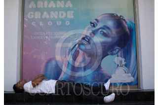 CIUDAD DE MÉXICO, 09JUNIO2019.- Un siesta a medio día bajo la mirada de la estrella del pop Ariana Grande, en avenida Juárez. FOTO: MOISÉS PABLO /CUARTOSCURO.COM