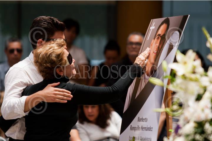 CIUDAD DE MÉXICO, 10JUNIO2019.- Entre abrazos y lágrimas, familiares, amigos, alumnado y autoridades de la Universidad del Pedregal despidieron con una misa en la explanada del plantel a Norberto Ronquillo Hernández, estudiante secuestrado el 04 de junio y cuyo cuerpo fue encontrado en las primeras horas de hoy en Xochimilco. FOTO: GALO CAÑAS /CUARTOSCURO.COM