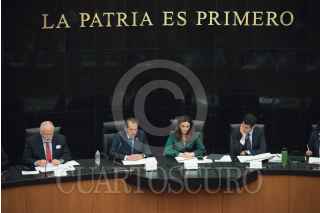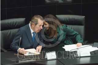 CIUDAD DE MÉXICO, 12JUNIO2019.- Porfirio Muñoz Ledo, presidente de la directiva de la Cámara de Diputados, y Nancy de la Sierra Aramburo, senadora del PT, durante la realización del foro Las tres dimensiones del desarrollo: una oportunidad para legislar con futuro en México, como parte de las actividades del Grupo de Trabajo de la Agenda 2030 en el Senado de la República. FOTO: MARIO JASSO /CUARTOSCURO.COM