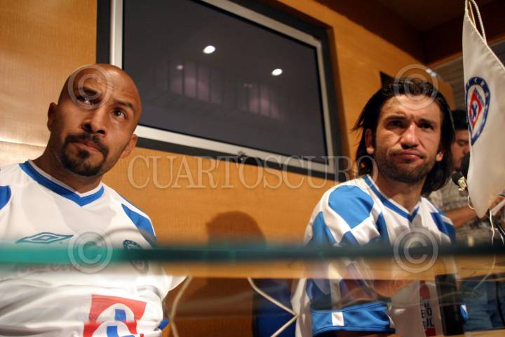 MEXICO, D.F. 17MAYO2005.- Oscar, ¨el conejo¨, Pérez, y Francisco, kikin , Fonseca, en conferencia al término de su entrenamiento, a unos días de su encuentro con el América. FOTO: Sandra Perdomo/CUARTOSCURO.COM
