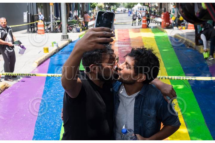 CIUDAD DE MÉXICO, 15JUNIO2019.- Unas chicas se tomaron una selfie atrás de la bandera LGBTTTI, durante el "Sábado de Tequio", realizado en la calle de Liverpool, colonia Juárez. FOTO: GRACIELA LÓPEZ /CUARTOSCURO.COM