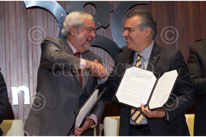 CIUDAD DE MÉXICO, 17JUNIO2019.- Enrique Graue, rector de la UNAM y Francisco Cervantes Díaz, presidente de la Confederación de Cámaras Industriales de los Estados Unidos Mexicanos (CONCAMIN), se saludaron después de la firma del convenio CONCAMIN-UNAM, el cual es una alianza en favor de la transformación Industrial en México. El acto se realizó en el Auditorio de la CONCAMIN. FOTO: GRACIELA LÓPEZ /CUARTOSCURO.COM