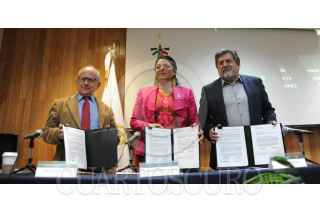 CIUDAD DE MÉXICO, 18JUNIO2019.- Diego Prieto Hernández, director general del INAH; Alejandra Frausto Guerrero, secretario de Cultura, y Rogelio Jiménez Pons, titular del Fonatur, durante la firma del convenio que impulsará el cuidado del patrimonio cultural durante la construcción del Tren Maya FOTO: MAURICIO MARAT /INAH/CUARTOSCURO.COM