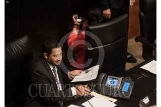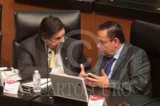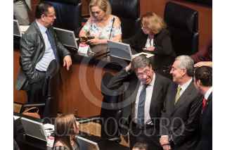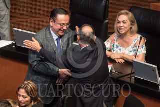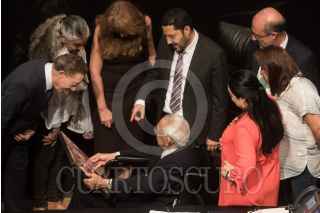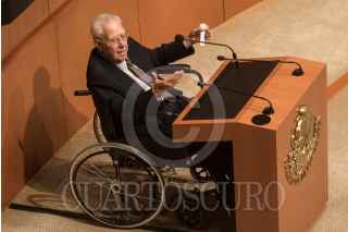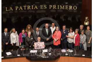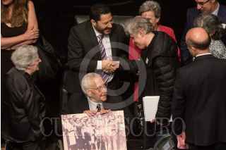 CIUDAD DE MÉXICO, 18JUNIO2019.- Martí Batres, presidente de la Mesa Directiva del Senado, y el exiliado Julián Atilano, observan una fotografía en donde se observa al ex presidente Lázaro Cárdenas, al final de la sesión solemne por el 80 aniversario del Exilio Español en el Senado de la República. FOTO: ISAAC ESQUIVEL /CUARTOSCURO.COM