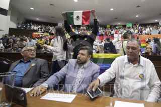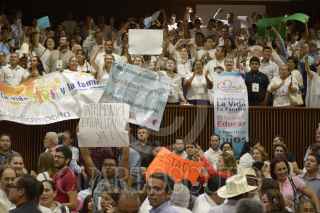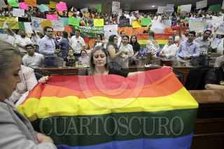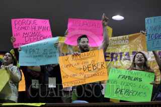 CULIACÁN, SINALOA, 18JUNIO2019.- En medio de gritos de manifestantes en pro y en contra de la iniciativa de Ley de Matrimonio Igualitario en Sinaloa, los diputados de la 63 Legislatura votaron en mayoría en contra del dictamen. El proyecto de ley se había prolongado por más de 5 años, y esta mañana recibió su primera lectura en el Congreso de Sinaloa obteniendo una respuesta negativa, con 20 votos en contra y 18 a favor. La iniciativa presentada por la entonces diputada Merary Villegas de Morena recibió lectura este mañana. En el documento se especifican diversos estatutos que las modificaciones a la constitución requieren para hacer posible la unión legal entre personas del mismo sexo. Luego de la participación de representantes de las diferentes bancadas de partidos en el Congreso, la votación se vio polarizada entre diputados de los diferentes partidos, el dictamen negativo imposibilita a la iniciativa a ser votada en este mismo periodo de sesiones. El lugar se abarrotó de representantes de grupos religiosos y de representantes LGBT+, quienes aseguran que no se van a cansar y que se buscará aprobar la iniciativa en el siguiente periodo. FOTO: JUAN CARLOS CRUZ /CUARTOSCURO.COM