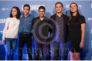 CIUDAD DE MÉXICO, 20JUNIO2019.- Los actores Gabriel Carbajal, Leidi Gutiérez, Benny Emmanuel y Marta Nuñez, junto con Gael García Bernal, director de la película "Chicuarotes", se tomaron una fotografía, al finalizar la conferencia de prensa en la anunciaron el estreno de la película el próximo 27 de junio en todos los cines. FOTO: GRACIELA LÓPEZ /CUARTOSCURO.COM