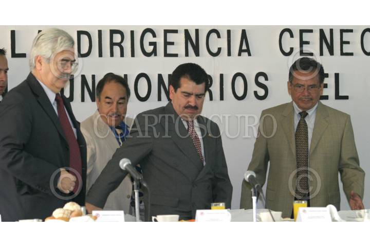 MEXICO, D.F. 20MAYO2005.- Ramón Martín Huerta, titular de la Policia Federal Preventiva, Heladio Ramírez, líder de la Confederación Nacional Campesina y Miguel Angel Yunez durante un reunión en la sede de dicha confederación. FOTO: Nelly Salas/CUARTOSCURO.COM