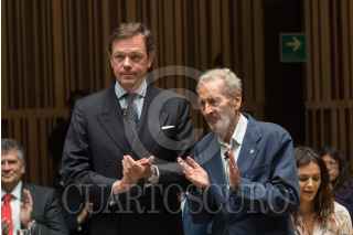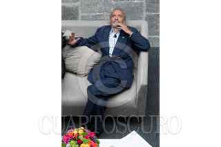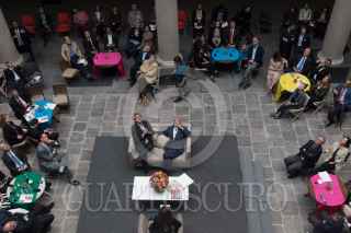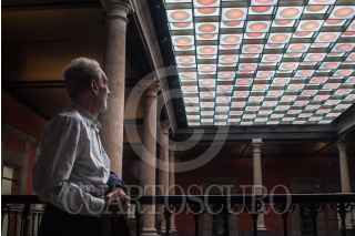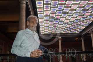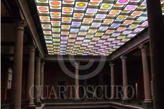 CIUDAD DE MÉXICO, 25JUNIO2019.- Vicente Rojo mostró su "Versión Celeste", un vitral luminoso e interactivo que esta colocado en un plafón del patio principal del Monte de Piedad, el artista comentó que lo hizo de esta forma para atraer la atención del publico que se congrega ahí mientras espera, por ello decidió utilizar luces que se movieran, que forman figuras geométricas. Esta obra única de este tipo en el trabajo del artista nacido en Barcelona, es parte de la remodelación de la casa matriz del Monte de Piedad, ubicada en el Centro Histórico. FOTO: MOISÉS PABLO /CUARTOSCURO.COM