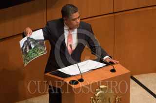 CIUDAD DE MÉXICO, 26JUNIO2019.- El senador panista Víctor Oswaldo Fuentes Solís durante la sesión de la Comisión Permanente en el Senado, en donde mostró una foto de la Cueva de la Boca, ubicada en Monterrey, Nuevo León, y en la que habitan seis especies de murciélagos, urgió al gobierno local y federal implementen medidas para protegerla y preservarla. FOTO: MOISÉS PABLO /CUARTOSCURO.COM