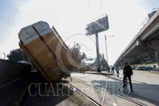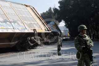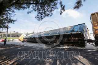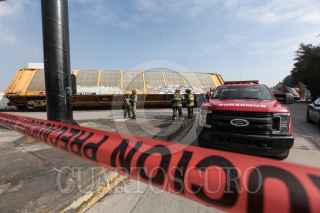 TOLUCA, ESTADO DE MÉXICO, 27JUNIO2019.- Durante la mañana de este jueves tres vagones de un tren se descarrilaron en la avenida Albert Einstein y su cruce con Paseo Tollocan, en la zona industrial de Toluca, quedaron recargados en la barda de una bodega del lugar, la zona fue acordonada por Protección Civil de Toluca, los trabajos de retiro tardarán algunas horas ya que se necesitan grúas especiales, no se registraron heridos solo son daños materiales. FOTO: CRISANTA ESPINOSA AGUILAR /CUARTOSCURO.COM