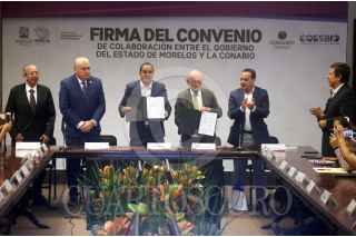 CUERNAVACA, MORELOS, 27JUNIO2019. El gobernador de Morelos, el exfutbolista Cuauhtémoc Blanco Bravo y José Sarukhan, investigador y ex rector de la Universidad Nacional Autónoma de México y actual Coordinador General de la Comisión Nacional para el Conocimiento y Uso de la Biodiversidad (CONABIO), durante la firma de un convenio de colaboración entre el gobierno de Morelos y la CONABIO. FOTO: MARGARITO PÉREZ RETANA /CUARTOSCURO.COM
