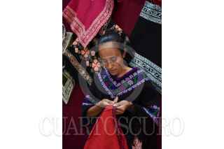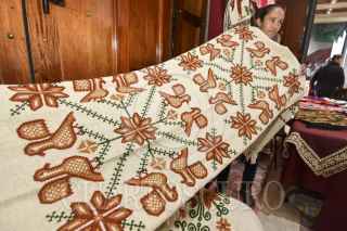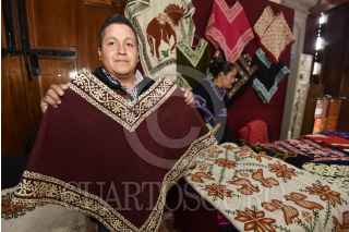 TOLUCA, ESTADO DE MÉXICO, 27JUNIO2019.- Lourdes Ordóñez y Juventino García, originarios de Fresno Nichi, en San Felipe del Progreso elaboran prendas echas de lana y bordadas a mano con motivos mazahuas, las cuales les lleva elaborar de 5 días hasta 5 meses; colcha, abrigos, quexquemtl, chalecos, el trabajo de la lana lo aprendieron de sus abuelos y su comunidad se caracteriza por este trabajo, las prendas las mostraron durante una exposición artesanal instalada en la Cámara de Diputados. FOTO: CRISANTA ESPINOSA AGUILAR /CUARTOSCURO.COM