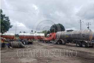 LA UNIÓN MONTES DE OCA, GUERRERO, 27JUNIO2019.- Personal de la Fiscalía General de la República (FGR) aseguró cerca de 200 mil litros de hidrocarburo, 26 tractocamiones y dos tanques de almacenamiento, al cumplimentar una orden de cateo en un inmueble ubicado en el municipio de La Unión de Isidoro Montes de Oca, Guerrero. El Ministerio Público Federal (MPF) solicitó y obtuvo el mandamiento, otorgado por el Juez de Distrito Especializado en el Sistema de Justicia Penal Acusatorio, adscrito al Centro de Justicia Penal Federal en el estado de Guerrero, con residencia en Acapulco de Juárez, para el domicilio ubicado en la carretera federal 200 Zihuatanejo - Lázaro Cárdenas. Se aseguraron ocho tractocamiones, con doble semi remolque y tanques tipo pipa, que cuentan con una capacidad de 30 mil litros aproximadamente; 18 tractocamiones con plataforma; así como dos tanques de almacenamiento, con capacidad de 40 mil y 100 mil litros, con bombas de distribución; lo anterior en su conjunto, puede almacenar y transportar hasta 380 mil litros. En la diligencia, en la que se detuvo a tres personas, participaron elementos de la Policía Federal Ministerial (PFM) y peritos de la Coordinación General de Servicios Periciales, además de que se contó con el apoyo de la Policía Estatal de Guerrero. FOTO: FGR /CUARTOSCURO.COM