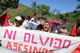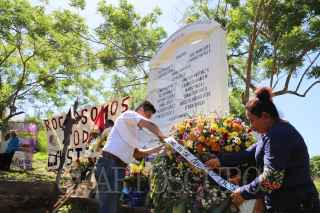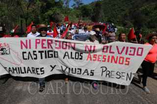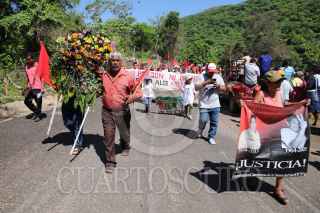 COYUCA DE BENÍTEZ, GUERRERO, 28JUNIO2019.- Marchan Integrantes de la Organización Campesina de la Sierra del Sur (OCSS) en el vado de Aguas Blancas, en este municipio de la región de Costa Grande, para conmemorar el aniversario 24 de la matanza de Aguas Blancas, en que fueron asesinadas 17 personas campesinos acribillados a manos de la policía estatal motorizada, en el periodo del ex gobernador de Guerrero, Rubén Figueroa Alcocer. Organizaciones exigieron al presidente de la República, Andrés Manuel López Obrador, retomar el caso Aguas Blancas y se castigue a los culpables del crimen, al recalcar que se trata de un crimen de Lesa humanidad. Al concluir la caminata, inició un acto cívico en el mausoleo dedicado a los campesinos asesinados, en donde se colocaron ofrendas florales veladoras. FOTO: BERNANDINO HERNÁNDEZ /CUARTOSCURO.COM
