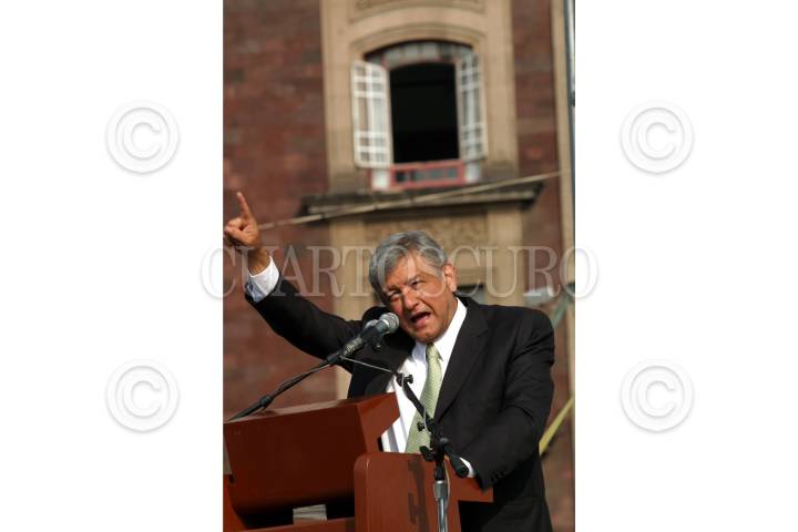 MEXICO, D.F., 27MAYO2005.- Andrés Manuel López Obrador, jefe de gobierno, encabezó la ceremonia de entrega a microcréditos en la plancha del Zócalo. FOTO: Moisés Pablo/CUARTOSCURO.COM