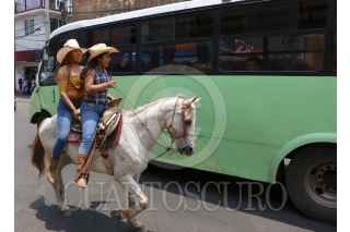 CIUDAD DE MÉXICO, 30JUNIO2019.- Dos mujeres montan a caballo frente a la mirada de asombro de usuarios del transporte público en una de las avenidas del Centro de Tláhuac, cabe destacar que esta demarcación es de los puntos con más índice de violencia en la ciudad, donde la Guardia Nacional desplegada este domingo aún no tiene presencia. FOTO: ROGELIO MORALES /CUARTOSCURO.COM