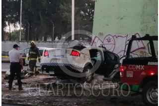 CIUDAD DE MÉXICO, 01JULIO2019.- Una patrulla de tránsito chocó contra la base de un puente vehicular de la avenida República Federal y avenida Zaragoza, en el accidente murieron dos policías. FOTO: ARMANDO MONROY /CUARTOSCURO.COM