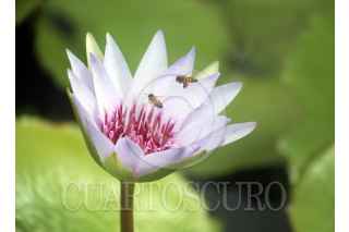 JIUTEPEC, MORELOS, 01JULIO2019. Abejas vuelan sobre un nenúfar de espectacular forma y sutil color en un jardín de este municipio. FOTO: MARGARITO PÉREZ RETANA /CUARTOSCURO.COM