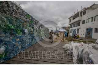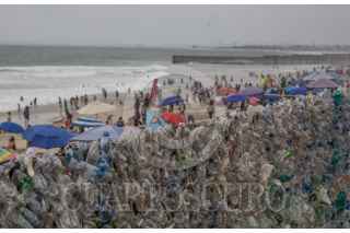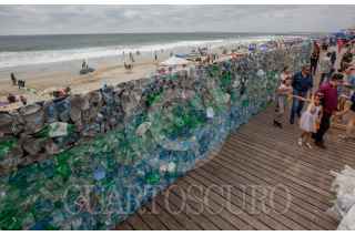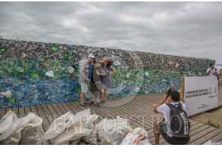 TIJUANA, BAJA CALIFORNIA, 07JULIO2019.- Colectivos ecologistas construyeron un muro de basura en Playas de Tijuana, con la intención de advertir y crear conciencia a los visitantes de la playa sobre la contaminación ocasionada por los residuos plásticos. La obra está compuesta por basura recolectada a lo largo del malecón y en distintos puntos de la ciudad fronteriza. FOTO: OMAR MARTÍNEZ /CUARTOSCURO.COM