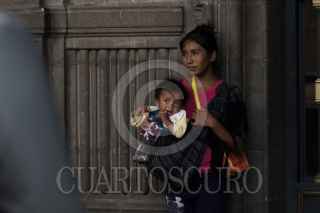 CIUDAD DE MÉXICO, 09JULIO2019.- Mujer indigena espera junto con su bebé frente al Antiguo Palacio de Ayuntamiento. FOTO: ANDREA MURCIA /CUARTOSCURO.COM