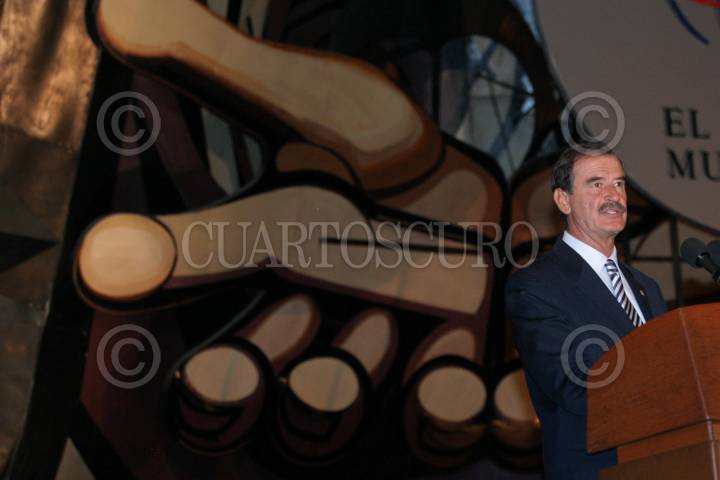 MEXICO, D.F., 09JUNIO2005.- Vicente Fox Quesada, presidente de la República y José Luis Barraza, presidente de la COPARMEX, clausurarn la Celebración del Pacto Mundial en México, en el Polyforum Siquieros. FOTO: Moisés Pablo/CUARTOSCURO.COM