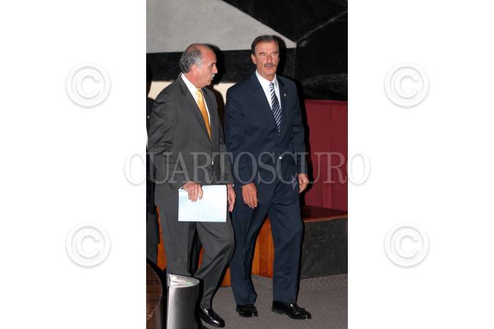 MEXICO, D.F., 09JUNIO2005.- Vicente Fox Quesada, presidente de la República y José Luis Barraza, presidente de la COPARMEX, clausurarn la Celebración del Pacto Mundial en México, en el Polyforum Siquieros. FOTO: Moisés Pablo/CUARTOSCURO.COM