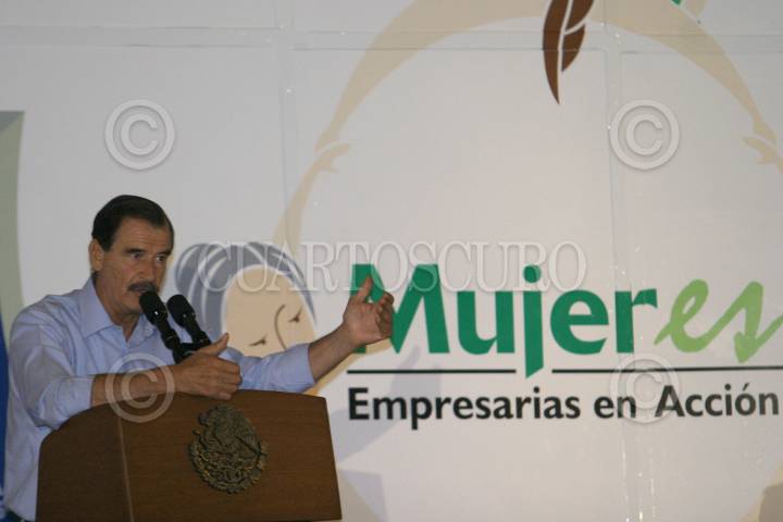 MEXICO, D.F. 10JUNIO2005.- El presidente Vicente Fox carga a una niña y se despide de mujeres asistentes al II Encuentro Nacional de Empresarias Sociales FONAES 2005. FOTO: Nelly Salas/CUARTOSCURO.COM