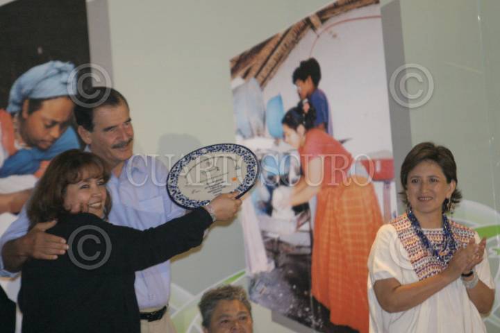 MEXICO, D.F. 10JUNIO2005.- El presidente Vicente Fox carga a una niña y se despide de mujeres asistentes al II Encuentro Nacional de Empresarias Sociales FONAES 2005. FOTO: Nelly Salas/CUARTOSCURO.COM