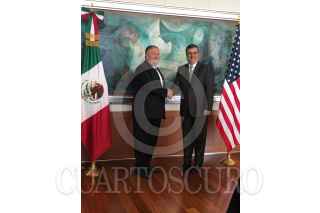 CIUDAD DE MÉXICO, 21JULIO2019.- Mike Pompeo, secretario de Relaciones Exteriores y Marcelo Ebrard, secretario de Relaciones Exteriores (SRE), se saludaron al iniciar la reunión privada para dialogar sobre migración irregular, el Tratado México-Estados Unidos-Canadá (T-MEC) y el Plan de Desarrollo Integral para Centroamérica, la cual se realiza en las instalaciones de la SRE. FOTO: ESPECIAL /CUARTOSCURO.COM