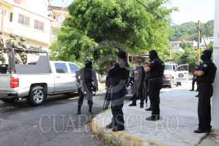 ACAPULCO, GUERRERO, 21JULIO2019.- Tres agentes viales y un policía auxiliar de la Secretaría de Seguridad Pública de Acapulco en estado de ebriedad dispararon sus armas de cargo en la calle Niños Héroes de Veracruz y Horacio Nelson, Fraccionamiento Costa Azul, el hecho se registró a primeras horas de este domingo, situación que provocó temor de los habitantes de esta zona de alta plusvalía del puerto de Acapulco. Los uniformados a cargo del Secretario, Gerardo Rosas Azamar, estaban de fiesta en dicho domicilio acompañados de cuatro sexoservidoras, los constantes disparos provocaron la movilización de todas las corporaciones policíacas, que trataron de ocultar el hecho para no ensuciar la imagen de los policías de la alcaldesa, Adela Román Ocampo, los cuales fueron detenidos por policías ministeriales, peritos realizaron las indagatorias en el lugar de los hechos. FOTO: BERNANDINO HERNÁNDEZ /CUARTOSCURO.COM