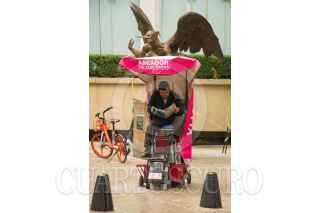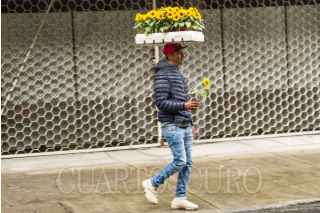 CIUDAD DE MÉXICO, 25JULIO2019.- Un vendedor de girasoles, camina con por las calles de la Colonia Roma, llevando sobre su cabeza el producto. FOTO: ROGELIO MORALES /CUARTOSCURO.COM