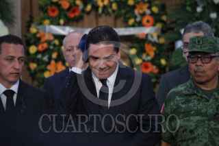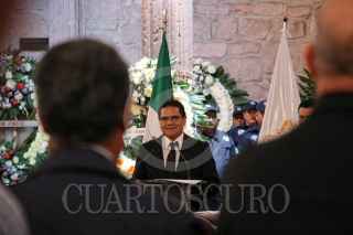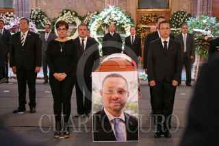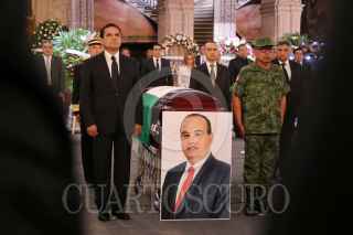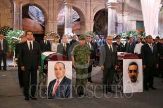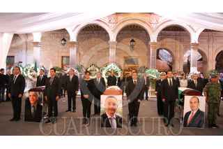 MORELIA, MICHOACÁN, 25JULIO2019. Con un homenaje de cuerpo presente, el gobierno de Michoacán despidió al secretario de Seguridad Pública, Martín Godoy; al director del Seguro Popular, Germán Ortega, y a los dos pilotos que perdieron la vida tras el desplome del helicóptero en que viajaban. El homenaje se llevó a cabo este jueves, en el patio principal de Palacio de Gobierno y fue encabezado por el gobernador Silvano Aureoles, también se tuvo la asistencia de todos los integrantes del gabinete legal y ampliado, así como de los integrantes de la Mesa de Seguridad. FOTO: JUAN JOSÉ ESTRADA SERAFÍN /CUARTOSCURO.COM