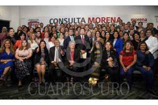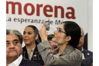 CIUDAD DE MÉXICO, 25JULIO2019.- La diputada Geraldine Ponce toma unas fotografías con su celular durante la conferencia de Mario Delgado en la que presentó la consulta “13 Desafíos para que siga la 4ta Transformación” rumbo a la renovación de Morena. FOTO: MARIO JASSO /CUARTOSCURO.COM