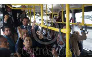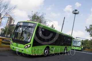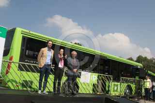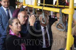 CIUDAD DE MÉXICO, 30JULIO2019.- Claudia Sheinbaum, Jefa de Gobierno; Andrés Lajous, secretario de Movilidad, y Ramón Jiménez López, director del RTP de la Ciudad de México, durante el banderazo de salida de 18 unidades que circularán por el Circuito Bicentenario, estas unidades cuentan con cámara de seguridad, botón de pánico, y rampa para personas en silla de ruedas. FOTO: MOISÉS PABLO /CUARTOSCURO.COM