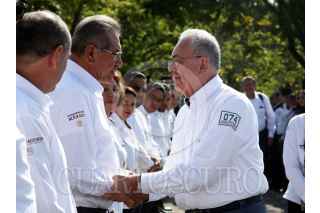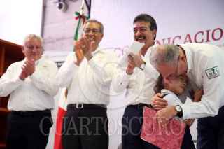 CUERNAVACA, MORELOS, 31JULIO2019. Javier Jiménez Espriú, secretario de Comunicaciones y Transportes durante la celebración oficial por el 61 aniversario de Caminos y Puentes Federales (Capufe). En la imagen el funcionario abraza a la niña Alison Díaz Juárez, quien participó en el acto al recitar las efemérides del mes de julio. Lo acompañan Genaro Utrilla Gutiérrez, director de Capufe y Héctor Castañeda Molina, director de la SCT en la entidad. FOTO: MARGARITO PÉREZ RETANA /CUARTOSCURO.COM