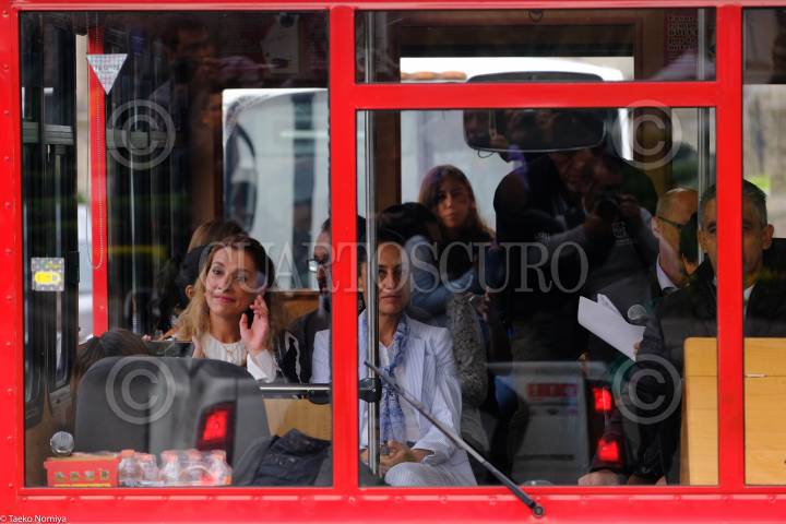 CIUDAD DE MÉXICO, 01AGOSTO2019.- Beatriz Gutiérrez Müller, escritora y presidenta del Consejo Honorario de la Coordinación Nacional de Memoria Histórica y Cultural de México, y Claudia Sheinbaum, jefa de Gobierno, encabezaron un "Recorrido en tranvía por la primera etapa de la Galería de Arte Urbano", el cual consiste en intervenciones de expresiones artísticas en las cortinas de diferentes establecimientos del Centro Histórico. FOTO: GRACIELA LÓPEZ /CUARTOSCURO.COM