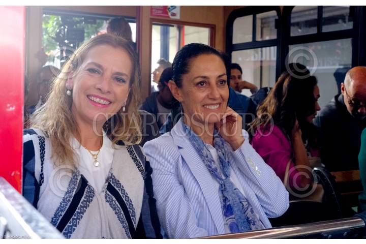 CIUDAD DE MÉXICO, 01AGOSTO2019.- Beatriz Gutiérrez Müller, escritora y presidenta del Consejo Honorario de la Coordinación Nacional de Memoria Histórica y Cultural de México, y Claudia Sheinbaum, jefa de Gobierno, encabezaron un "Recorrido en tranvía por la primera etapa de la Galería de Arte Urbano", el cual consiste en intervenciones de expresiones artísticas en las cortinas de diferentes establecimientos del Centro Histórico. FOTO: GRACIELA LÓPEZ /CUARTOSCURO.COM