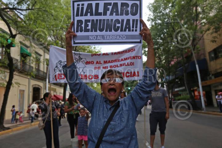 GUADALAJARA, JALISCO, 03AGOSTO2019.- Miembros del Colectivo Asamblea Popular contra el Tarifazo y decenas de personas de la sociedad civil se manifestaron esta tarde y marcharon del Parque Rojo hasta Palacio de Gobierno, para inconformarse con el gobierno en turno encabezado por el Gobernador Enrique Alfaro, por el aumento de la tarifa del transporte publico en una manifestación denominada “No al Tarifazo”. FOTO: FERNANDO CARRANZA GARCIA / CUARTOSCURO.COM