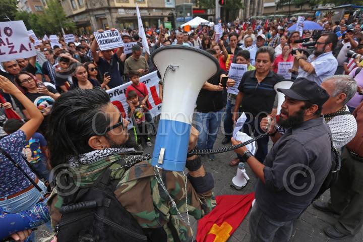 GUADALAJARA, JALISCO, 03AGOSTO2019.- Miembros del Colectivo Asamblea Popular contra el Tarifazo y decenas de personas de la sociedad civil se manifestaron esta tarde y marcharon del Parque Rojo hasta Palacio de Gobierno, para inconformarse con el gobierno en turno encabezado por el Gobernador Enrique Alfaro, por el aumento de la tarifa del transporte publico en una manifestación denominada “No al Tarifazo”. FOTO: FERNANDO CARRANZA GARCIA / CUARTOSCURO.COM