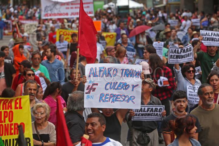 GUADALAJARA, JALISCO, 03AGOSTO2019.- Miembros del Colectivo Asamblea Popular contra el Tarifazo y decenas de personas de la sociedad civil se manifestaron esta tarde y marcharon del Parque Rojo hasta Palacio de Gobierno, para inconformarse con el gobierno en turno encabezado por el Gobernador Enrique Alfaro, por el aumento de la tarifa del transporte publico en una manifestación denominada “No al Tarifazo”. FOTO: FERNANDO CARRANZA GARCIA / CUARTOSCURO.COM