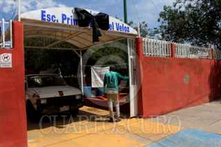 CIUDAD JUÁREZ, CHIHUAHUA, 06AGOSTO2019.- Compañeros de Elsa Mendoza Márquez, educadora y directora, colocaron un moño en la primaria donde trabajaba, la cual se ubica entre las calles Guadalupe Chaboya y Rubén Posada Pompa, en la colonia los Colorines. El acto simbólico es en representación de señal de luto por su asesinato ocurrido en el tiroteo de el Paso, Texas, cuando la directora se encontraba en el Walmart cuando sucedió el ataque. FOTO: NACHO RUÍZ /CUARTOSCURO.COM