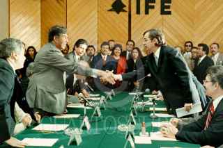 Cuauhtémoc Cárdenas y el presidente consejero del IFE, José Woldenberg, durante el registro del primero como candidato de la "Alianza por México" a la presidencia de la república.