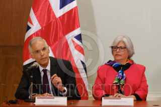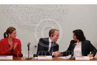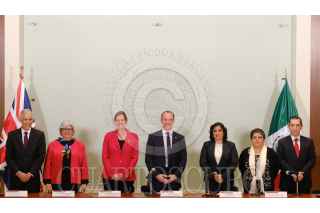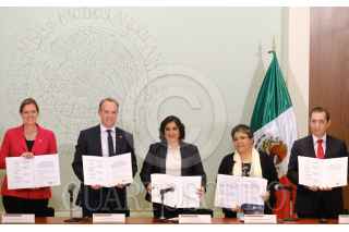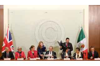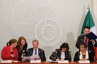 CIUDAD DE MÉXICO, 08AGOSTO2019.- Julián Ventura, subsecretario de Relaciones Exteriores; Graciela Márquez, secretaria de Economía; Corin Robertson, embajadora de Reino Unido en México; Dominic Raab, secretario de Estado para Asuntos Exteriores y de la Mancomunidad del Reino Unido de la Gran Bretaña e Irlanda del Norte; Irma Erendira Sandoval, secretaria de Función Pública; Raquel Buenrostro Sánchez, Oficial Mayor de la Secretaria de Hacienda y Crédito Público (SHCP), y Ricardo Salgado Perrilliat, secretario técnico de la Secretaría Ejecutiva del Sistema Nacional de Anticorrupcion, durante la Firma de un Memorándum de entendimiento en materia de Gobierno Digital, el cual se realizó en la Sala de Usos Múltiples de la SHCP, en Palacio Nacional. FOTO: GRACIELA LÓPEZ /CUARTOSCURO.COM
