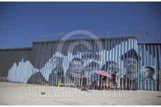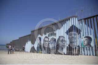 TIJUANA, BAJA CALIFORNIA, 10AGOSTO2019.- Una comunidad de jóvenes tijuanense encabezados por el artista Mauro Carrera, elaboraron el ¨Mural Interactivo Digital¨ en muro fronterizo que divide a México y Estados Unidos, con la intención de hacer visible los rostros de cinco jóvenes denominados 'dreamers’, quienes han sufrido las consecuencias de la deportación. FOTO: OMAR MARTÍNEZ /CUARTOSCURO.COM